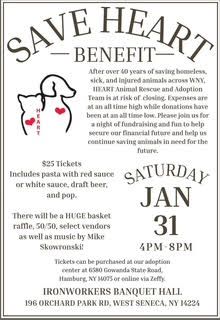 Includes Pasta dinner with choice of sauce (cat hair not included), beer, and pop. Also includes live music by Mike Skowronski and a chance to participate in our many raffles. The cats will not be in attendance as they have other very pressing matters to attend to but outside the event they can be seen at Heart Adoption Center on Gowanda St Rd in Hamburg!